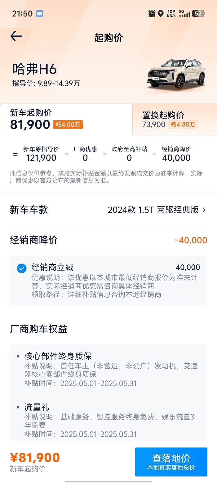 哈佛H6全款落地价多少?东莞这边能砍到10.2W吗?