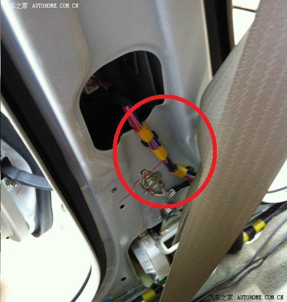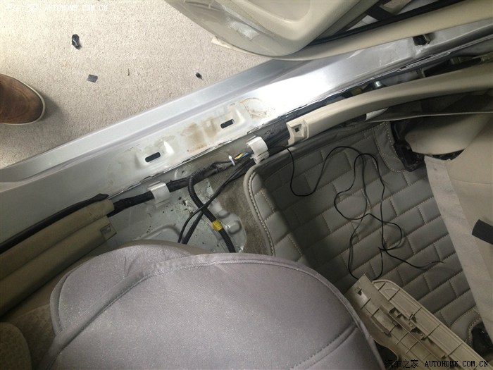 很轻松的拿掉B柱下护板,然后红圈中找到浅蓝色的开锁线。如需无损安装可以接到洞里面那个插口里,不过这里选择的是破线安装,比较省事,接好后用防水胶带包的扎扎实实的。