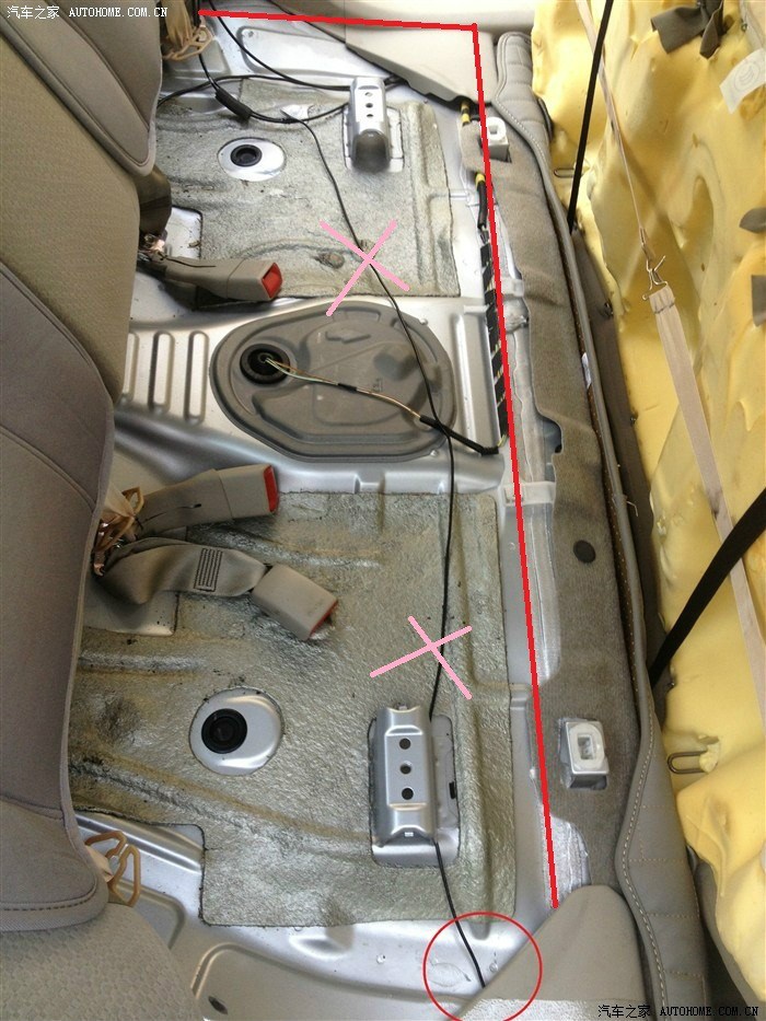 (这里顺便更正下之前倒车摄像头走线:图中走线会影响到拆换机油格,请按照红色标注走线,这样就没问题了)