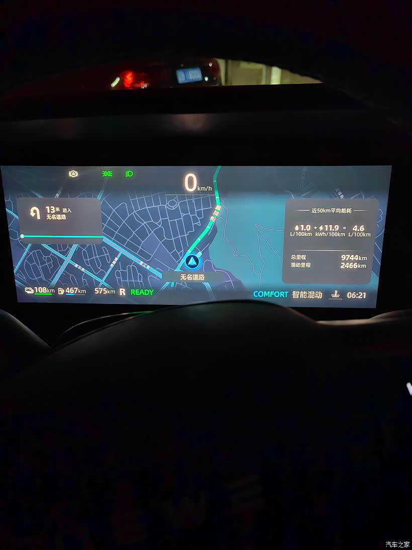 开始时纯电续航108km,期间周四又充了一次电,充到100km。发动机和电池的工作效率都处在较好区间,表显油耗稳定在3.9L/100km,电耗3.6kWh/100km,综合能耗5.0L/100km。气温在零度左右时,纯电模式电耗会在15kwh/100km左右。而当气温来到零下10度以下时,刚驾车表显电耗会来到夸张的25kwh/100km。低温对电续航里程的影响非常明显。此外,城市快速路路段的匀速行驶(最高时速100km/h)让发动机保持在经济转速区间,比频繁启停的城市拥堵路况更省油。