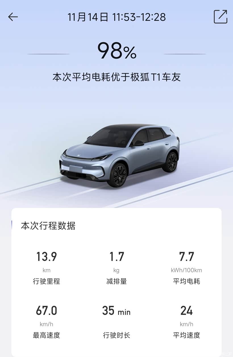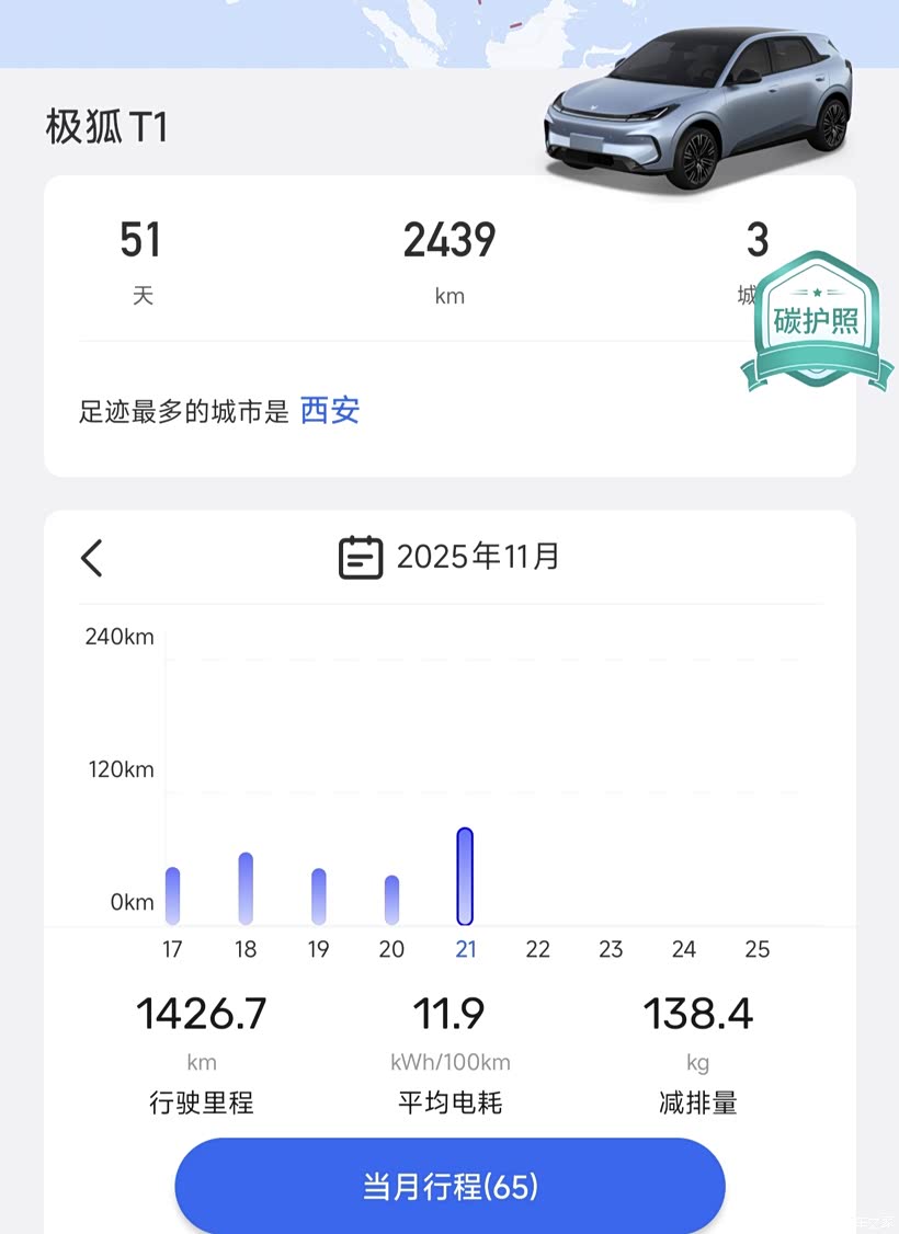 续航电耗表现,这一点是实打实的满意。从提车到现在51天,总行驶里程2439公里。10月份行驶943.8公里,平均电耗11.6kWh/100km;11月份行驶1360.2公里,平均电耗11.9kWh/100km。目前开过的最低电耗为7.7kWh/100km,这个成绩相当亮眼。