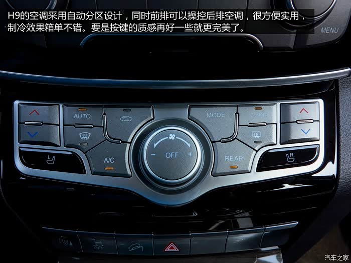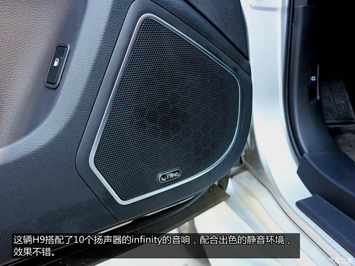 配置方面一直是中国品牌的优势所在,哈弗H9自然也不例外,这款豪华车型基本上能装备的都装上了,从电动可调记忆真皮座椅,大尺寸触摸屏媒体系统,舒适进入,分区自动空调,Infinity10扬声器音响到ASF随动转向氙灯,全地形反馈系统,倒车影像,可以说是配置相当不错,并且都是实用性的配置。并且一些电子配置告别了之前中国品牌比较山寨的特性,比如触控液晶屏,反应和清晰度都相当不错,功能也很强大,没有一点山寨的感觉了,实用性极大提升。