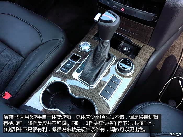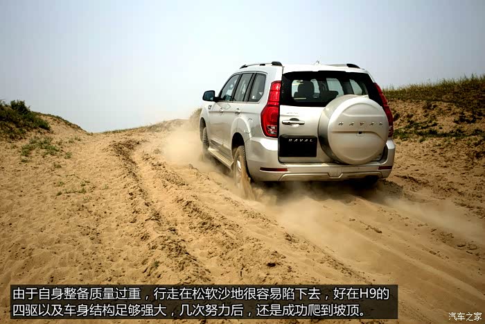 我想,能入手H9的人,除了看中它的大空间,其次就应该是它的越野能力了吧。没错,看看他的结构,非承载式车身,206毫米的最低离地间隙,28 度的接近角,同为23度的通过角和离去角,后轴限滑差速器,低速四驱扭矩放大,多地形反馈系统,600毫米涉水深度,265 60 18的固铂发现轮胎,拥有这一切要是不去非铺装路面撒撒欢,简直是暴遣天物了。实际越野体验中,H9确实是一把越野好手,较高的悬挂行程本身就让他在一切其他车辆认为是交叉轴的路况如履平地,同时,后轴限滑差速器,低速四驱扭矩放大,也让H9可以再极限情况下多了脱困的硬件条件,多地形反馈和各种坡度监测,机械油液的检测,也让越野变得简单。总结下来,H9的越野能力相当不错,可见长城多年的越野经验还是有帮助的。 当然,不足也还是存在的,首先就是自身重量过大,这样无论是对加速,对越野,对油耗都是硬伤,但是想想,这样一个非承载式的大家伙想减重也不是那么简单的,也算情理之中,但是,陡坡缓降的工作速度和变速箱无法锁定档位确实属于调教的问题,陡坡缓降速度过快,并且无法自我调整速度,所以并不是特别实用,变速箱换挡逻辑也还需要进一步优化,首先,1档几乎要在停车状态下才能挂上,这在越野需要持续大扭力爬坡时变得非常困难,同时下陡坡想用发动机低档位牵引制动,他会自己升档,让车越溜越快,这两点都是可以通过程序来调整的。希望长城能把H9优化的更完美。