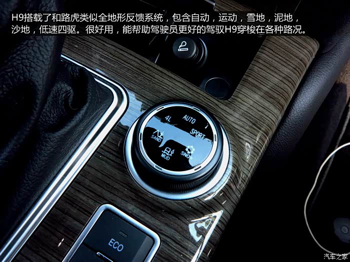 H9开起来怎么样呢,先从公路上说起,动力上这款H9只能说是中规中矩,虽然搭载了2.0升的涡轮增压发动机,参数也不错,但是碍于H9 两顿多的整备质量,提速只能说是够用,激情就别想了。与发动机相搭配的6速手自一体变速箱工作非常稳定,换挡也很平顺,齿比安排比较合理,就是换挡逻辑还是不够敏捷,尤其是深踩油门需要降挡时,总是犹豫一下,需要将油门踩得更深才会将挡,这方面可以更优化一下,可以弥补动力上的缺失。刹车倒是非常好用,前段比较偏软,有点像日系车的感觉,但是需要制动的时候,深踩一些,制动效果还是非常棉明显的,很踏实。底盘方面H9表现的比较扎实,并线入弯虽然称不上精准,但也算比较好驾驭,对比他的大块头,算是很满意了。如果方向再直接一点,虚位少一些,开起来会更加得心应手。隔音降噪方面可以说是我对H9的行驶品质中最为满意的一点,甚至用优秀都不过分,虽然他的大块头在高速行驶中对噪音抑制更具劣势,但是,80-120公里巡航时,只能听见轻微的风燥和胎噪,比绝大多数轿车表现都要好,可见长城在这方面是真的下功夫了,这也让H9的豪华感得以提升。