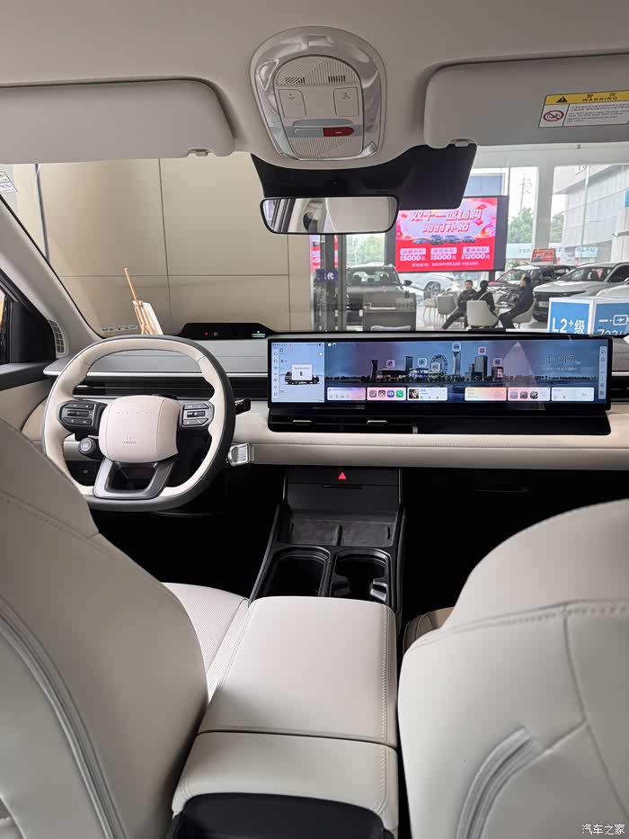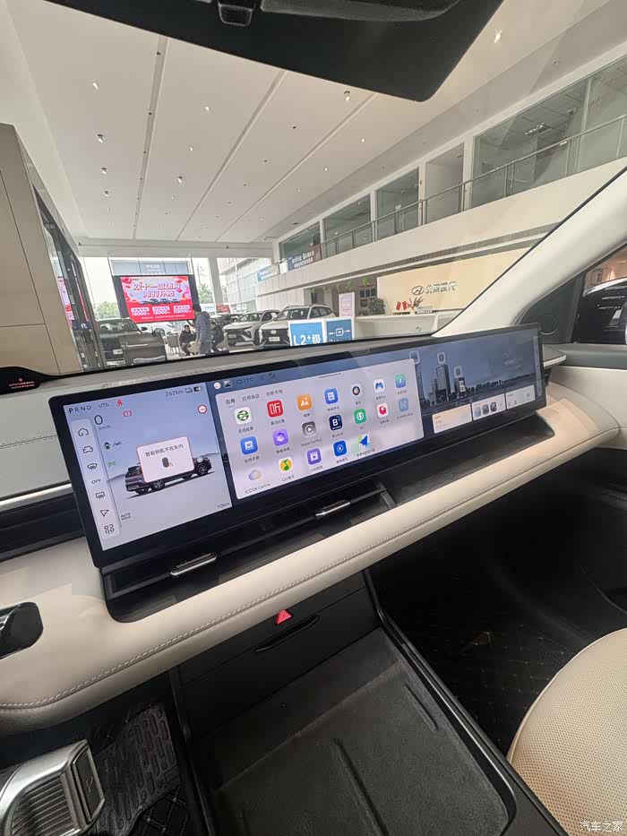 打开车门的瞬间,27英寸的宽幕屏直接把科技感拉满,但完全不浮夸。我特意选了正午阳光最足的时候坐进去,本以为屏幕会反光看不清,没想到它自动调亮后特别清晰,滑动导航、切换音乐完全不卡顿。销售说这是高通骁龙8295芯片的功劳,比我现在开的老燃油车车机流畅不止一个档次。