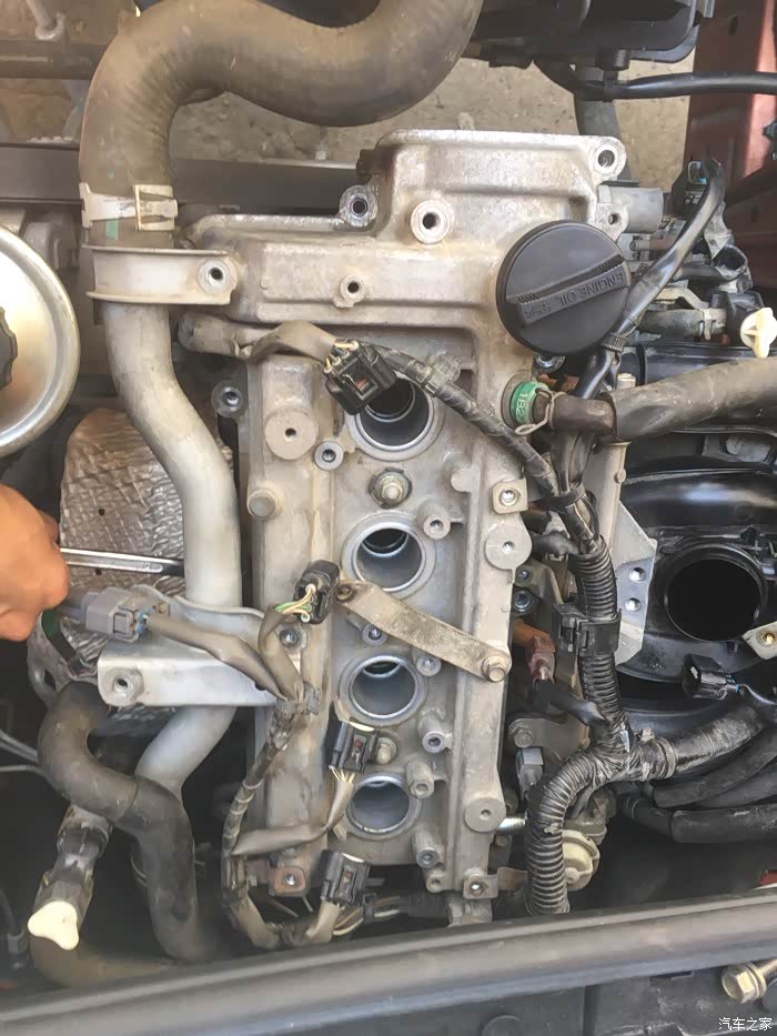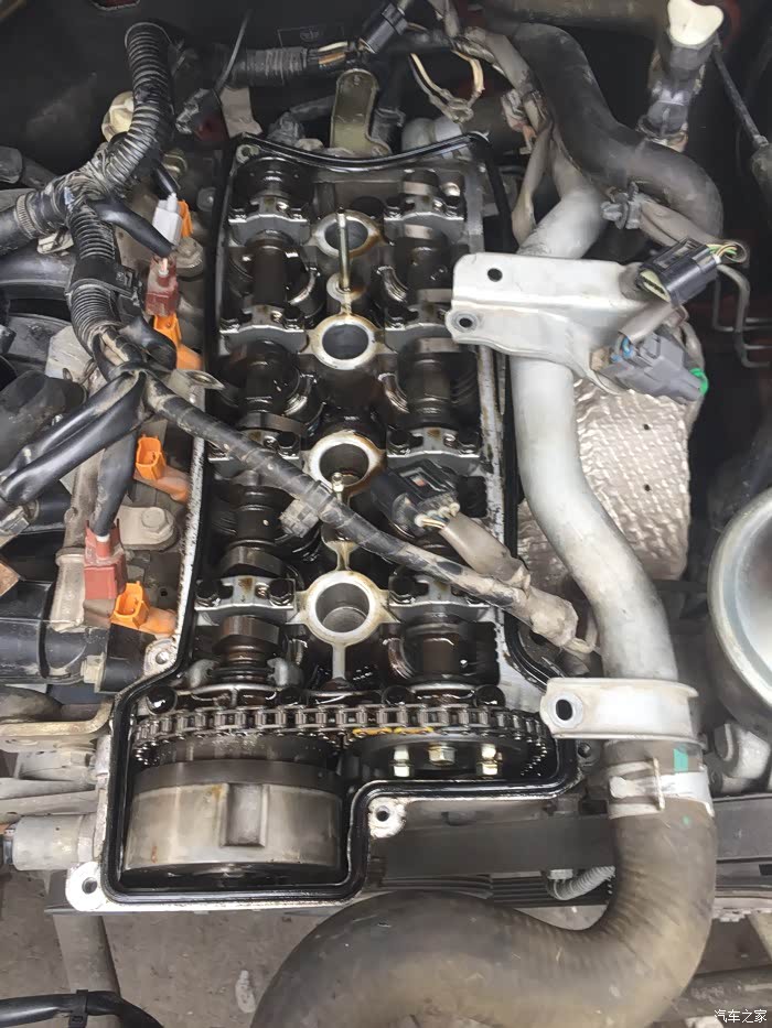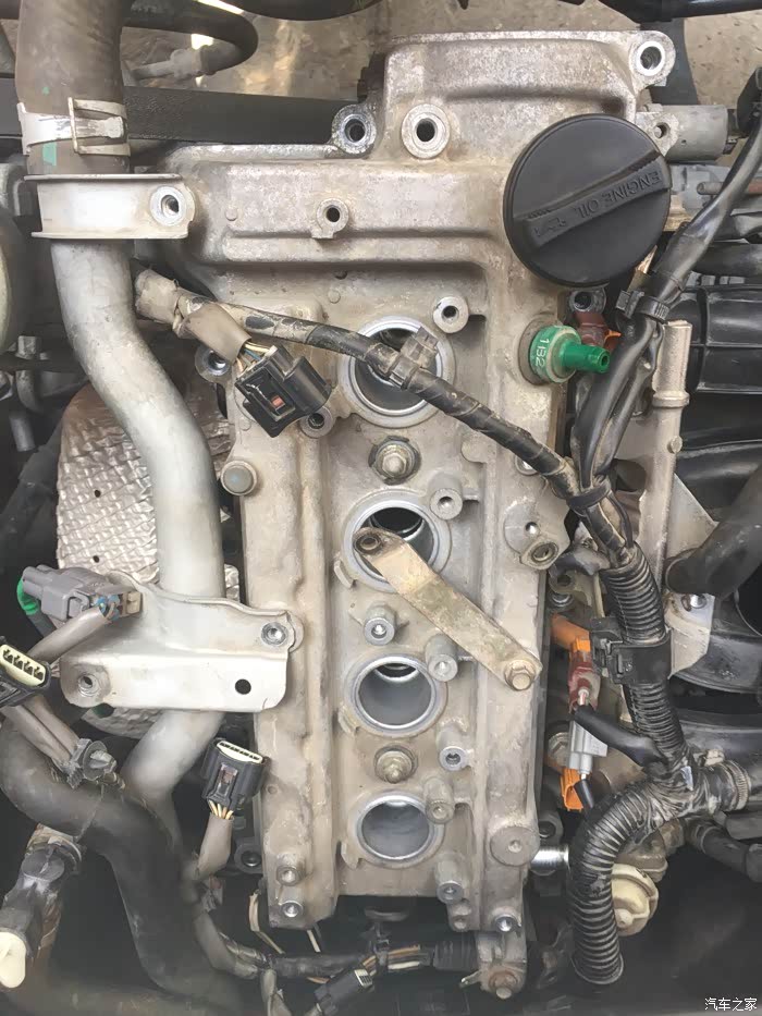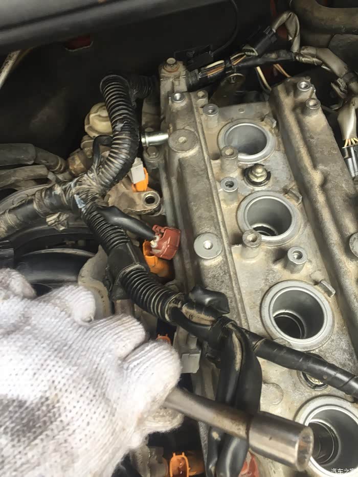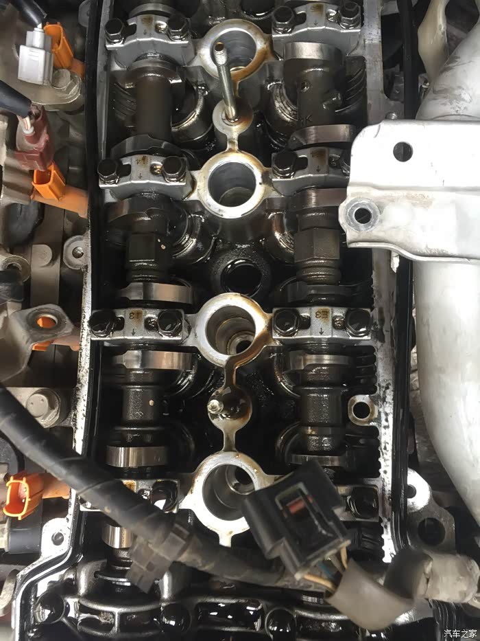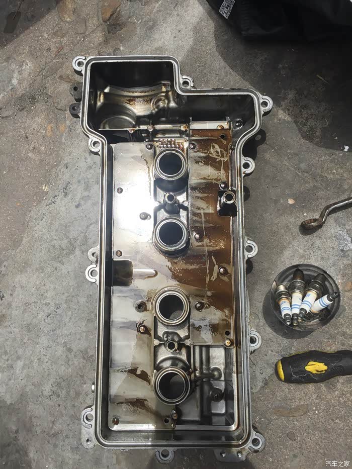 接下来就是拆洗喷油嘴了,拆下来之后发现蛮干净的,随便洗了一下没拍照……嘿嘿……该洗的都洗了,接下来就是拆气门盖了,拔掉上面所有的线束,然后拍照记录,接着一枚一枚螺丝拆下来放好,不能和之前那些螺丝混起来……要不然麻烦,所以都放地上,按循序放好,松螺丝时,可以使劲松,拧回去时,记住:千万要慢慢紧,差不多就行,要不然,铝制缸体很容易拧滑掉……拆出密封垫,原车主不知在哪修过,打过胶,里面有个火花塞垫没放好……导致火花塞缸体里面渗油……他奶奶的,真是不爱惜车的猪!清洗好气门盖顺便清理密封胶,晾干后再装上密封垫,直接装也可以,但是为了保险起见,每个弯头那我都打了发动机耐高温密封胶……弄好之后,原路返回,一个一个螺丝装,一个一个插头插……搞定!
