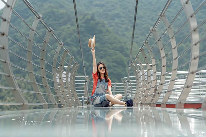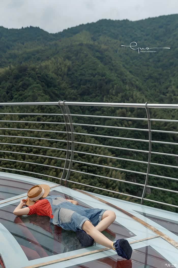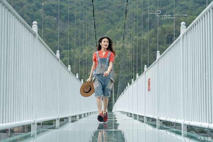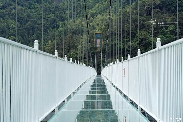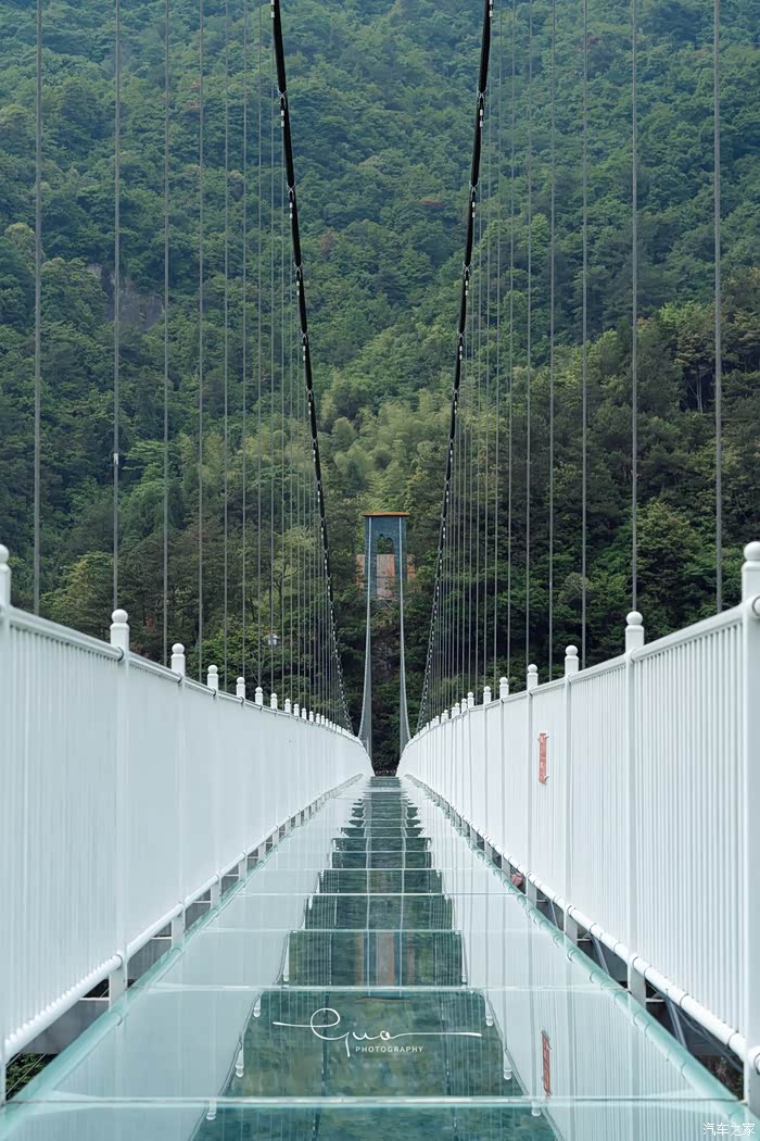 悬廊的另一边是华东最长的玻璃悬桥,悬桥比悬廊看起来危险性小了好多。穿过悬廊,另一边连着山的峭壁。站在悬桥上,四周空空荡荡,好像一个人拥有了整片森林。