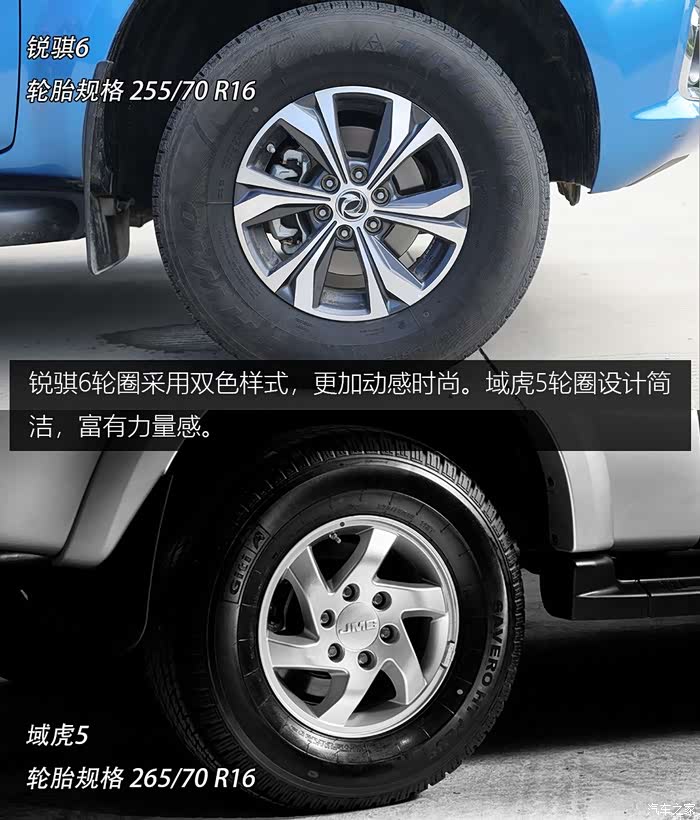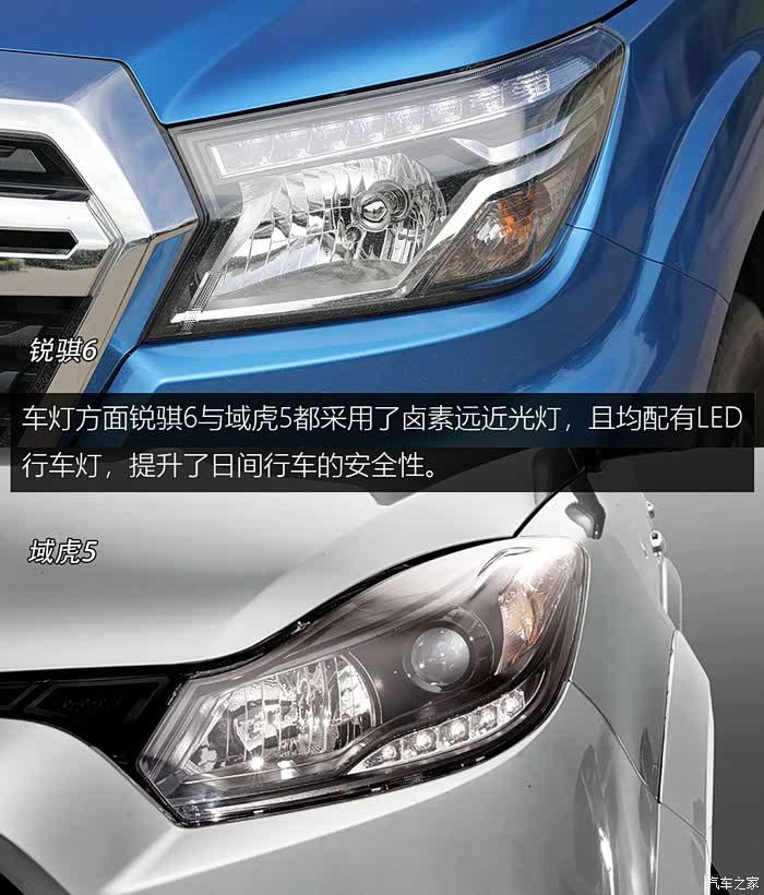车灯方面锐骐6与域虎5都采用了卤素远近光灯,且都配有LED行车灯,提升了日间行车的安全性。