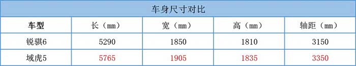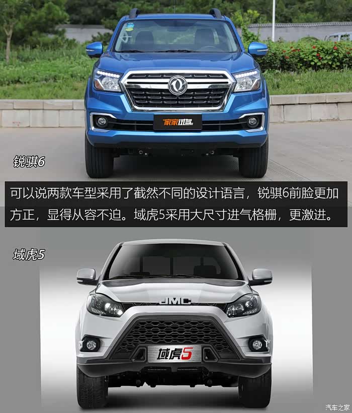 锐骐6与域虎5有着完全不同的外观设计风格,锐骐6前脸看起来更加方正,通过大面积镀铬中网来凸显霸气的车身。域虎5车头采用时下流行的“大嘴”式设计,更加夸张且富有攻击感。如果论耐看程度的话, 锐骐6会更有优势。