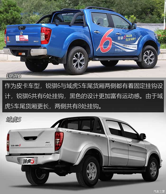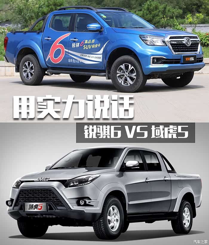 随着皮卡解禁的地区越来越多,因着皮卡车型强大的实用性,消费者的关注度也是水涨船高。在国内,中端皮卡是绝对的销量主力战场。本期对比的两台车型一台是来自郑州日产基于纳瓦拉车型打造的全新皮卡“锐骐6”,另一台是江铃域虎5。两者在相似的价格区间内都有着很高的关注度,下面我们来看看谁的实力更强?