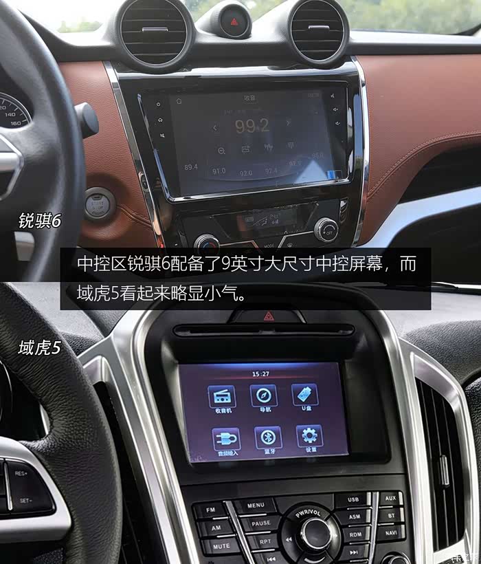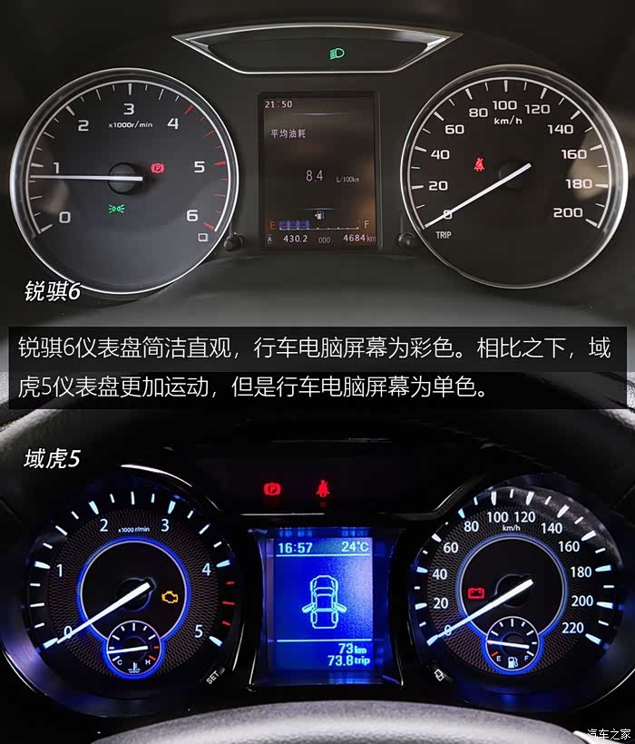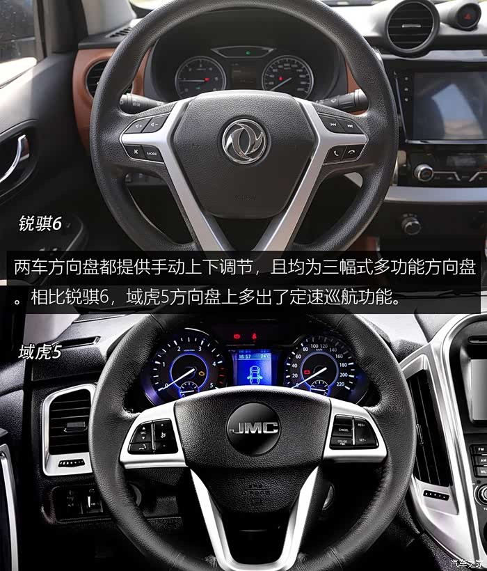 两车方向盘都提供手动上下调节,且均为三幅式多功能方向盘。相比锐骐6,域虎5方向盘上多出了定速巡航功能。锐骐6仪表盘简洁直观,行车电脑屏幕为彩色。相比之下,域虎5仪表盘更加运动,但是行车电脑屏幕为单色。