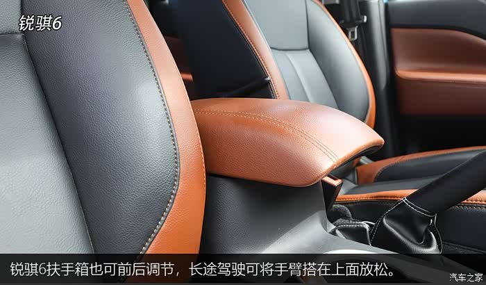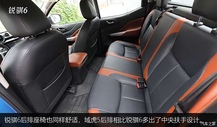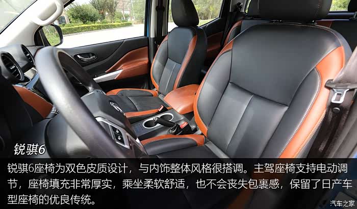 锐骐6座椅为双色皮质设计,与内饰整体风格很搭调。主驾座椅支持电动调节,座椅填充非常厚实,乘坐柔软舒适,也不会丧失包裹感,保留了日产车型座椅的优良传统。锐骐6扶手箱也可前后调节,长途驾驶可将手臂搭在上面放松。后排座椅也同样舒适,域虎5后排相比锐骐6多出了中央扶手设计。