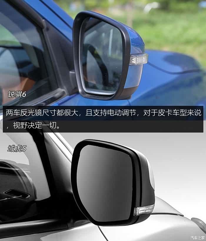 两车反光镜尺寸都很大,对于皮卡车型来说,视野决定一切。