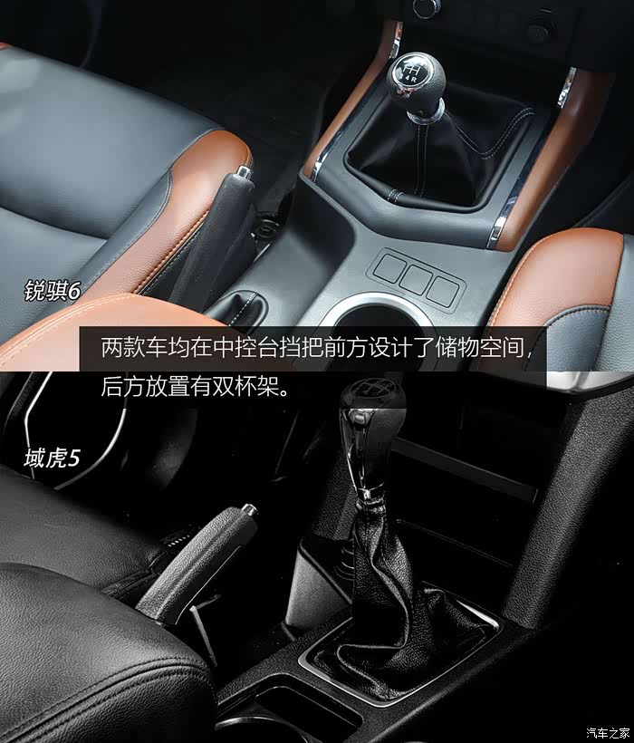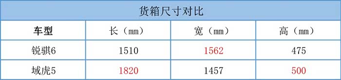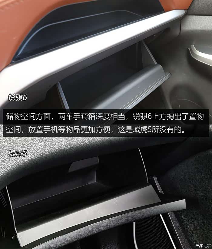 储物空间方面,两车手套箱深度相当,锐骐6上方掏出了置物空间,放置手机等物品更加方便,这是域虎5所没有的。两款车均在中控台挡把前方设计了储物空间,后方放置有双杯架。锐骐6手套箱内深度虽然一般,但是宽度还算不错。