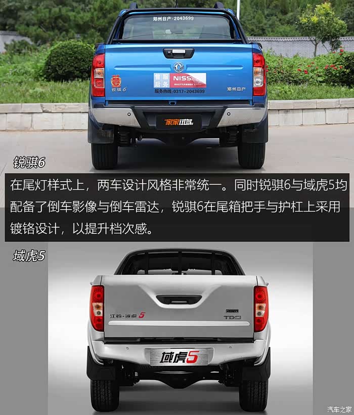 在尾灯样式上,两车设计风格非常统一。同时锐骐6与域虎5均配备了倒车影像与倒车雷达,锐骐6在尾箱把手与护杠上采用镀铬设计,以提升档次感。