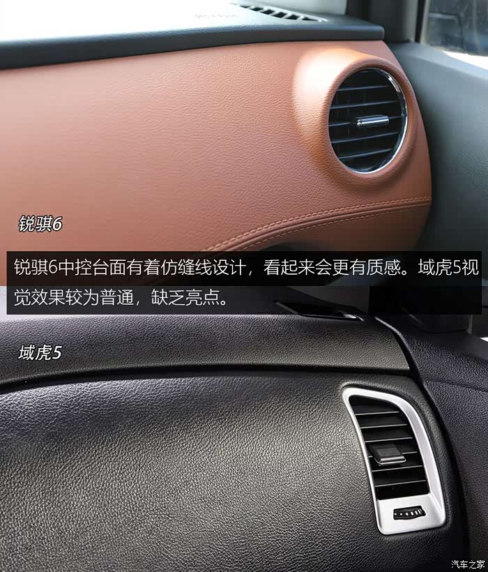 两款车内饰设计都非常顺眼,锐骐6的中控台更有层次感,采用了双色材质搭配。域虎5为经典飞翼式设计,有着不少福特车型的影子。锐骐6中控台面有着仿缝线设计,看起来会更具质感。域虎5视觉效果较为普通,缺乏亮点。
