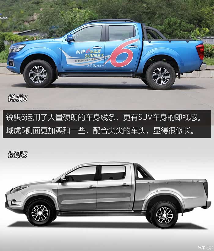 车侧区别还是不小的,锐骐6运用了大量硬朗的车身线条,凸显了美式肌肉的感觉,更有SUV车身的即视感。域虎5侧面更加柔和一些,配合尖尖的车头,显得车身侧面更加修长。