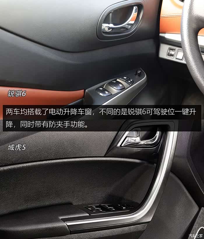 两车均搭载了电动升降车窗,不同的是锐骐6可驾驶位一键升降,同时带有防夹手功能。