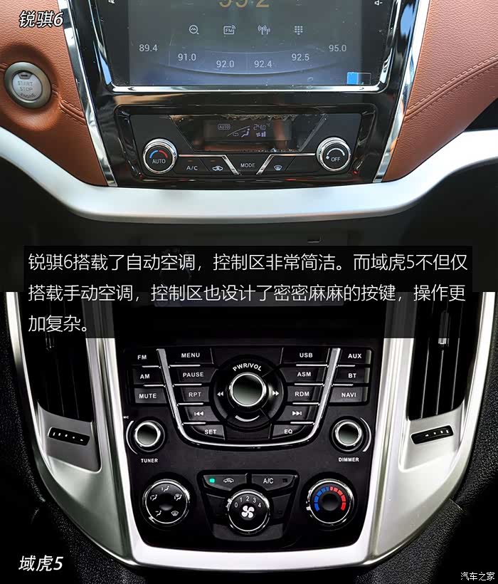 中控区锐骐6配备了9英寸大尺寸中控屏幕,而域虎5看起来略显小气。锐骐6搭载了自动空调,控制区非常简洁。而域虎5不但仅搭载手动空调,控制区也设计了密密麻麻的按键,操作更加复杂。