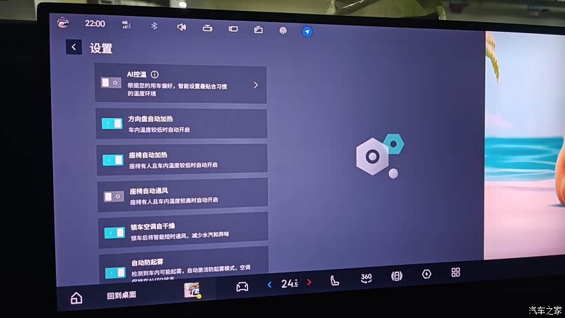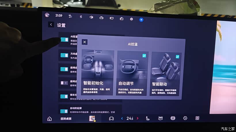 ai温控:自动调节温度、智能联动;自动加热、自动通风、自动防起雾、自动关闭后排空调、自动净化等等。
