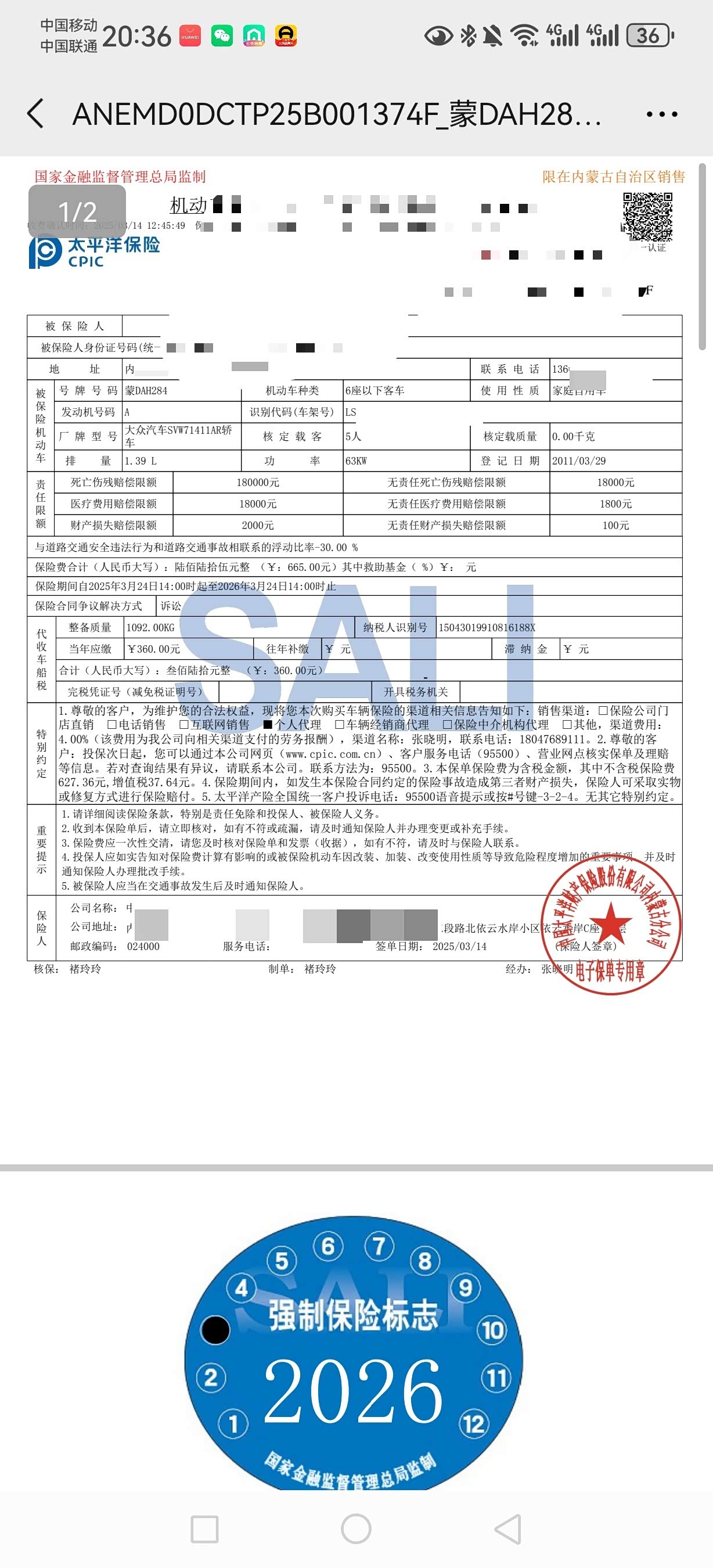 1. 保险费用:1736元
