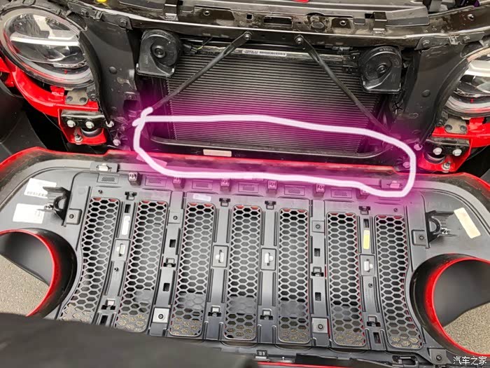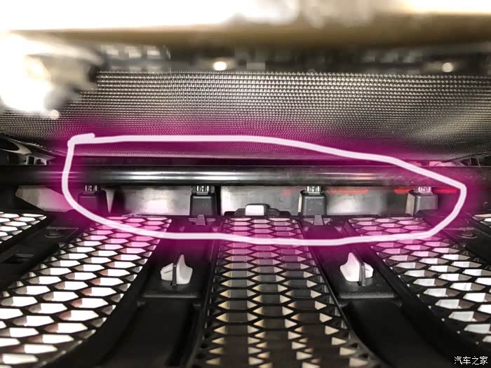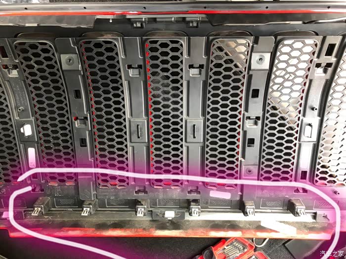 下来是中网的底部各类卡扣,这可难着我了,上面脱开后,下面怎么也拿不下来,也是被固定住的,撬开上部分一点往里面看,看到一排卡扣,但又不知道怎么弄下来。