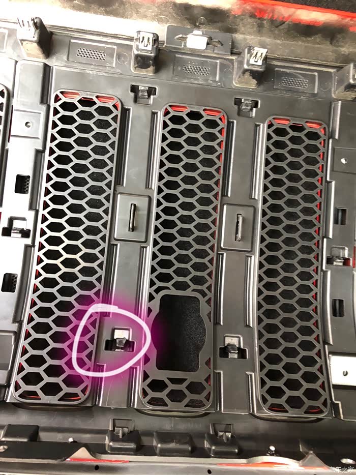 下来就是拆中网的配件了,这个东西是超级难拆,除了卸掉四颗螺丝,和两个白色卡扣外,还有六个固定扣