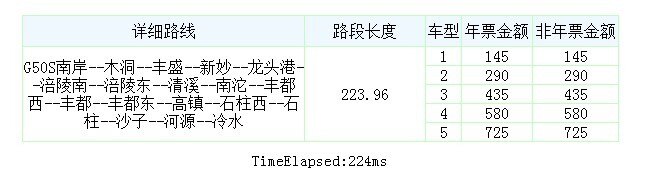 里程最短—544公里, 收费最低—410元。从G50S(沪渝南线,即沿江高速)出发经G50前往湖北宜昌。路线:G50S南岸站-涪陵-丰都-石柱-渝鄂交界-利川-恩施-宜都站里程:544.13公里路费:410元(重庆境内145元,湖北境内265元)。