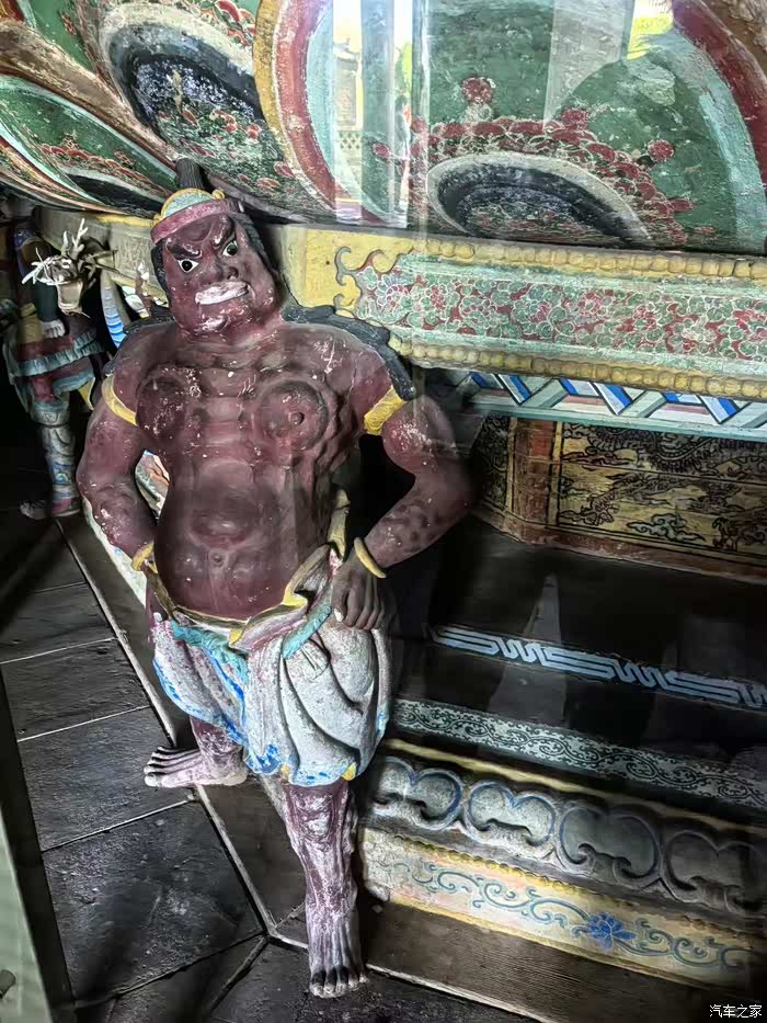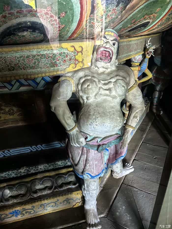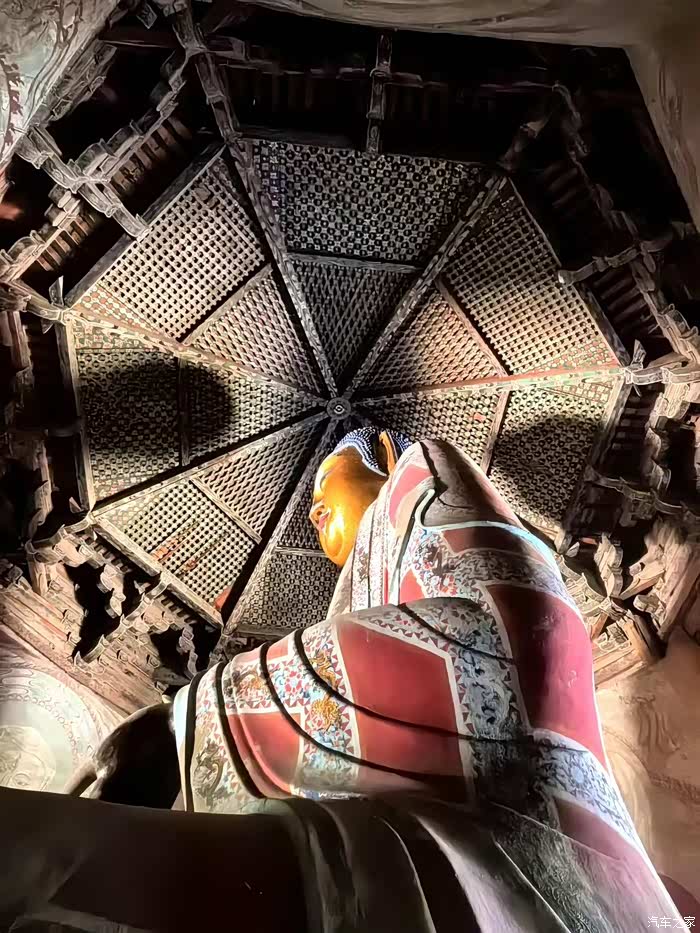 我随着人流走进木塔内部,因年久失修,目前只能参观一楼。一楼空间开阔,中央供奉着一尊巨大的佛像,佛像面容慈祥,双目微闭,仿佛在静静地守护着这座木塔。塔内光线较暗,没有任何照明措施,但这反而增添了一种神秘的氛围。在黑暗中,我能清晰地感受到木塔散发出来的历史气息,仿佛穿越时空,回到了那个遥远的年代。