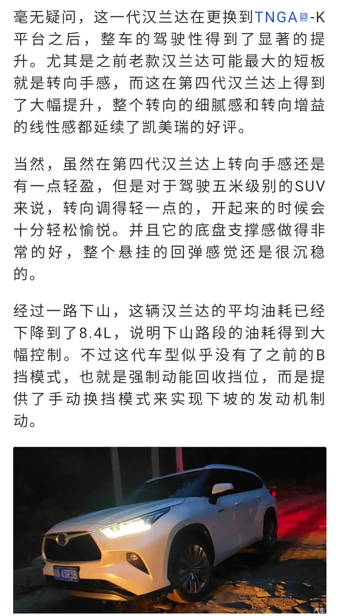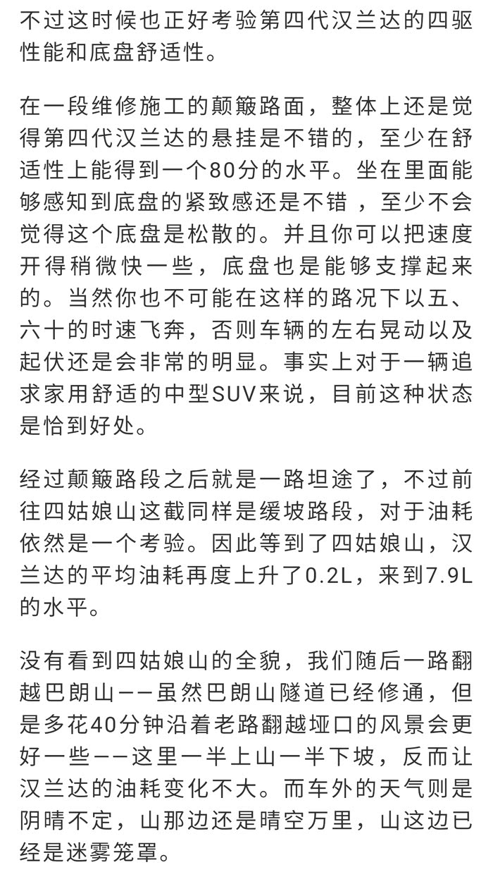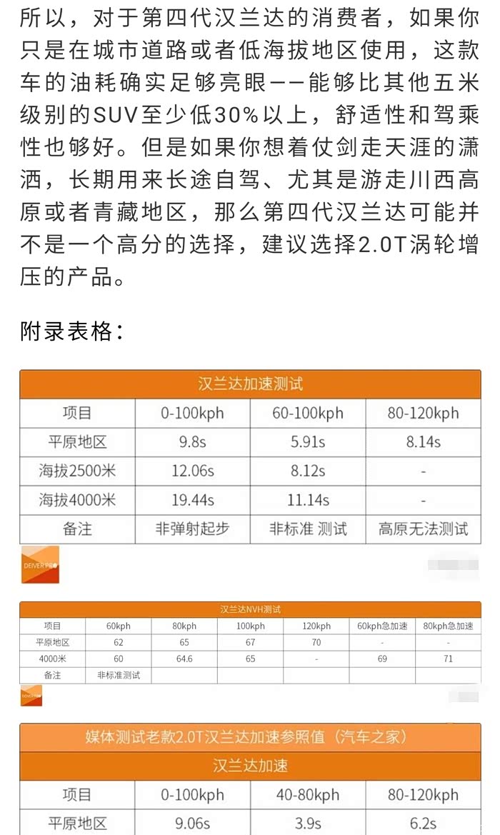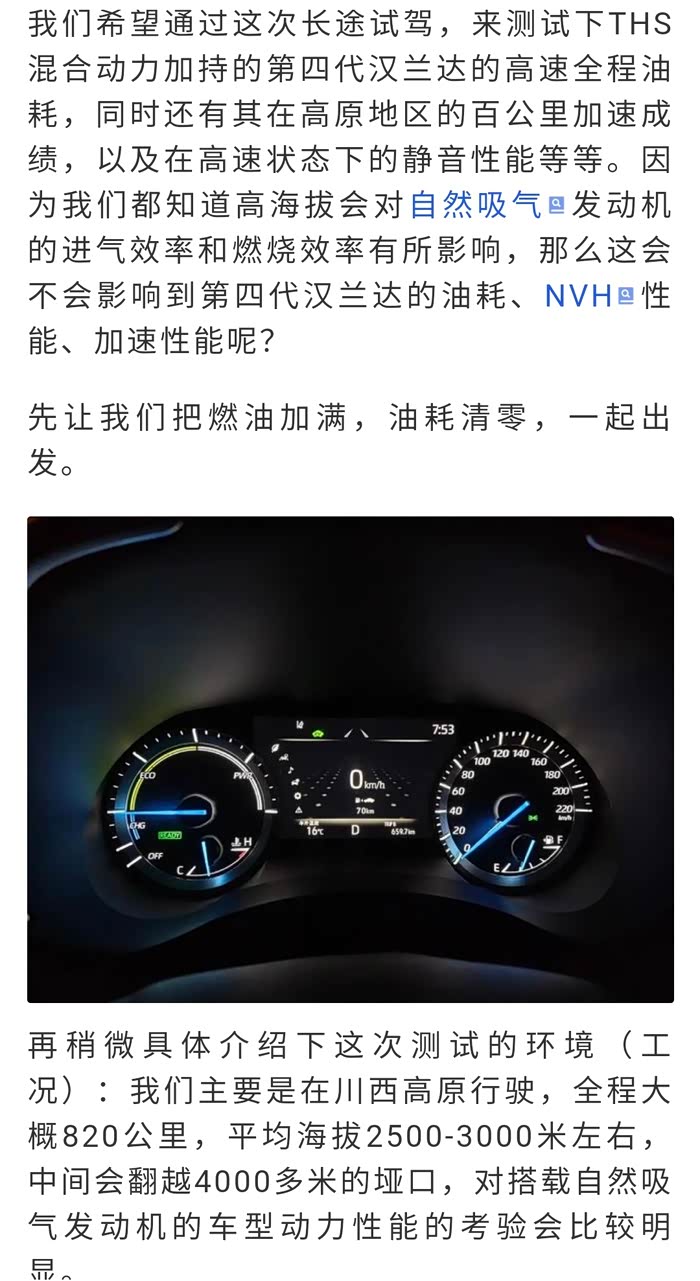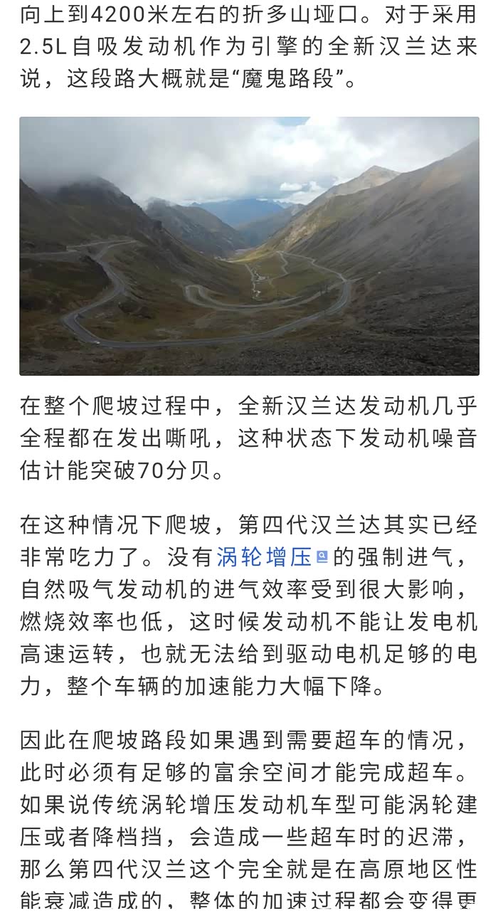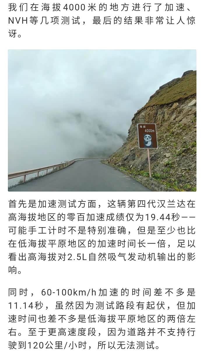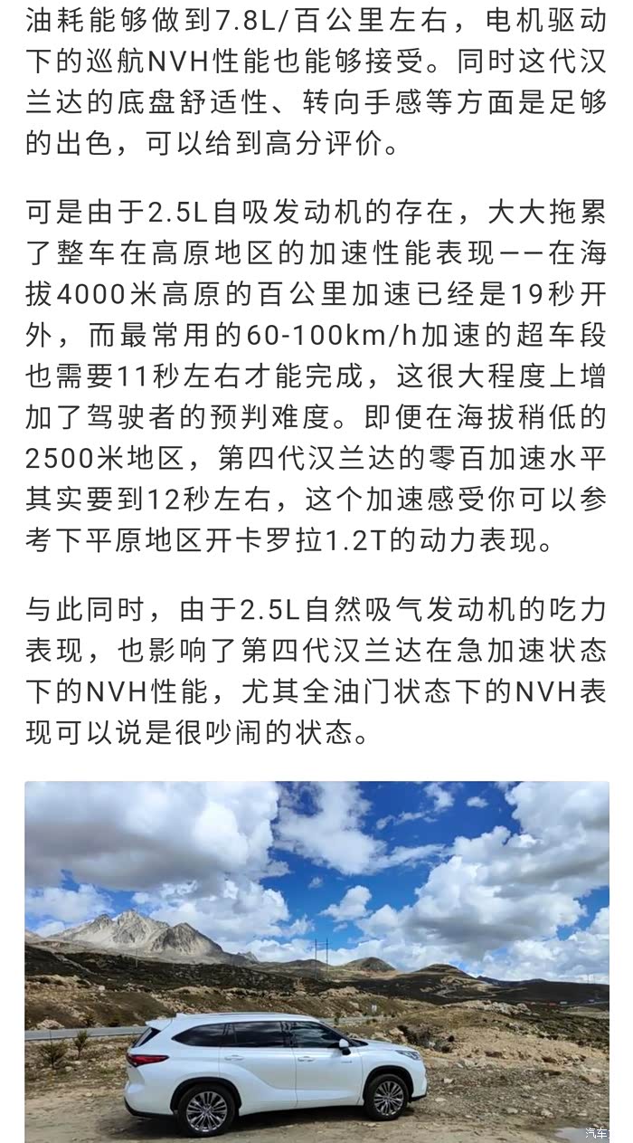 下面是老编辑爱汽车做的新汉兰达高原实测,也许对喜欢去西藏,青海,云贵高原还有川西高原长途自驾游的消费者有一点参考意义。并不是说小排量自吸就不能去这些地方了,很多吉姆尼,五菱宏光和长安奔奔之类的小排量自吸车都能去这些地方,只是跑的轻松程度不同而已。带涡轮增压的发动机在高原跑起更轻松一点,我自己是驾驶过2.0T汉兰达去过色达和稻城亚丁的,高原感觉动力和平原差别并不是很大。