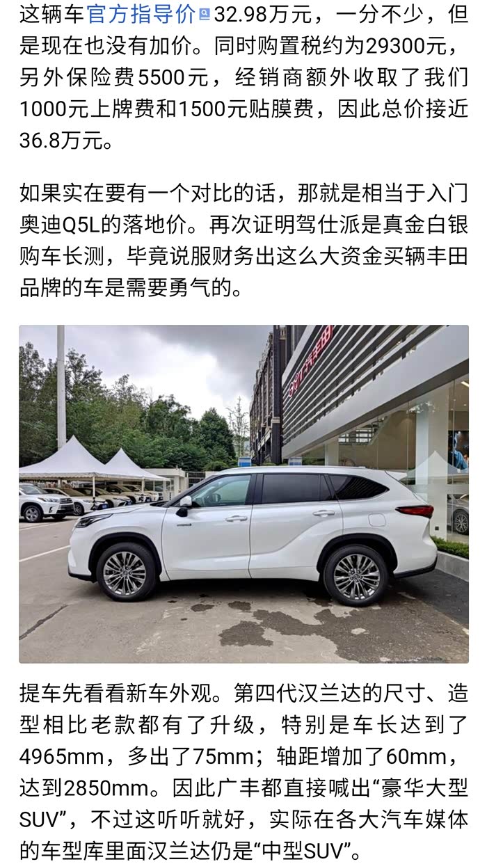 汉兰达目前是中国最火的中型SUV,随着超高的热度,其溢价率越来越高,新车定价和零配件价格也伴随着其溢价率的提高而上涨越来越多。
