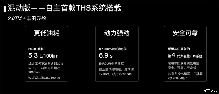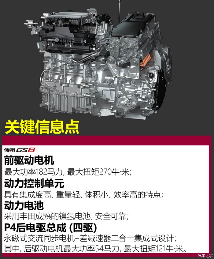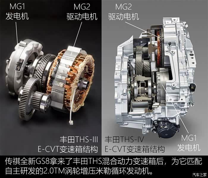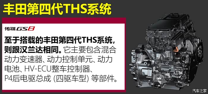 广汽可以看做丰田的合作伙伴,关系非常紧密,一起合作燃油车,电动车,混动车,爱信也跟广汽合资建造变速箱工厂,所以广汽第二代传祺GS8运用了大量丰田给予的技术,尤其是混动系统,丰田拿出了最新的THS四代混动系统,也就是新汉兰达相同的那套混动系统,不过混动汉兰达是搭配的2.5L自吸发动机,而GS8混动版是搭配的一台2.0T涡轮增压发动机,但是这台涡轮增压发动机又跟汉兰达2.0T发动机有太多相似之处,至于这两种搭配各有什么优缺点,后面再说。