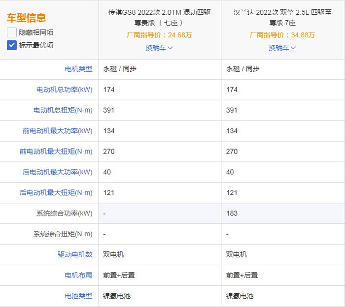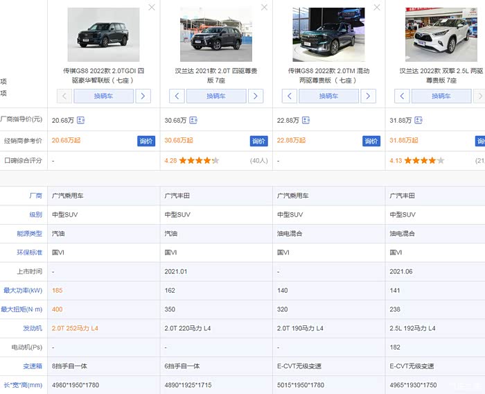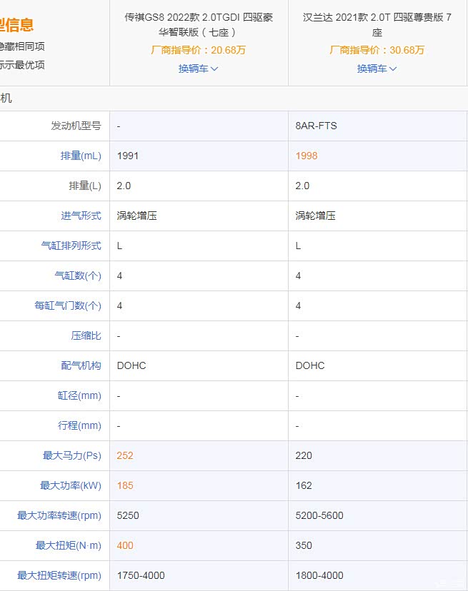 GS8相比汉兰达的优点主要是动力更强,不管是2.0T还是混动,功率都更大,尤其是混动版,百公里加速6.9秒,比混动汉兰达的8.5秒要快一些。2.0T版搭配的爱信8AT变速箱比老款汉兰达2.0T搭配的爱信6AT变速箱档位要多2个,对于燃油经济性和平顺性的帮助更多一点。混动版都是搭载的丰田E-CVT变速箱。热效率也差不多,油耗也差不多。