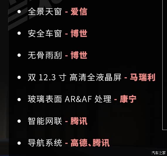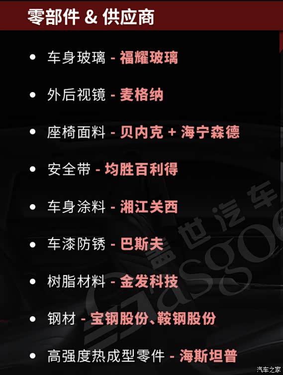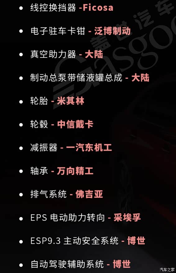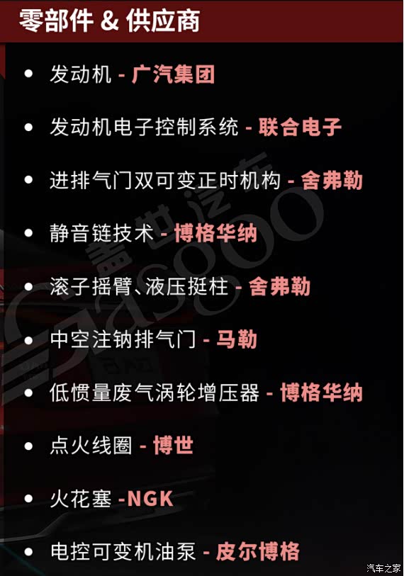 传祺的供应商中也有博世,麦格纳,电装,爱信,大陆,德尔福,IHI,海斯坦普,天合,伟世通,江森自控,博格华纳等等汽车零配件品牌,汽车零配件前一百强中有百分之80的品牌都是广汽的合作伙伴。
