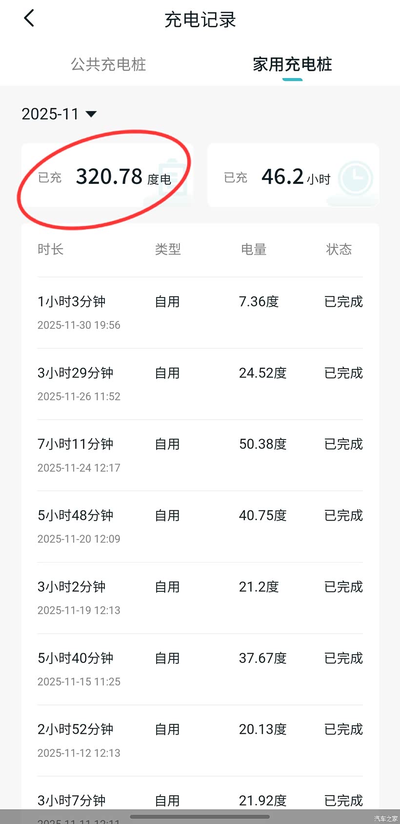 按照南网在线APP统计的,十一月整月家里充电桩的电表累计充电324.04度。我通常习惯在休息时间充电,比如周末不出行时,或者工作日的中午时,只要不耽误用车,都可以用家充,相对比较方便,也能更好地把控成本。