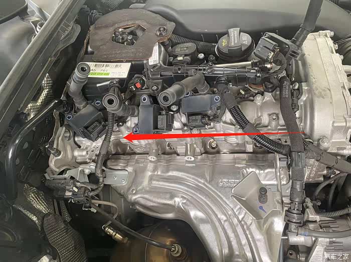 这里我想说一个重点,我在拆卸旧火花塞之前做了个标记,也就是说4支正常安装好的火花塞点火缺口都是统一朝驾驶室方向的,也就是如图箭头所示方向,这点从安装细节规范上来说是非常重要的;