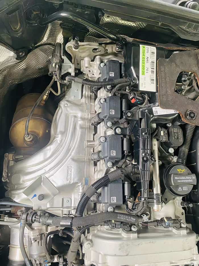 上图是本次作业所需要的工具和材料,需要用到的套筒型号分别为E8、E14、14mm火花塞套筒和扭矩棘轮扳手,其他工具为辅助,没有的可以不用准备,特别注意的是,火花塞安装需要规定范围的扭矩,所有建议大家尽量使用扭矩扳手进行作业。因为奔驰有很多款不同型号的发动机,火花塞的安装扭力也不一样,我会把不同型号的发动机火花塞安装扭力参数写在文章最后,供大家参考。