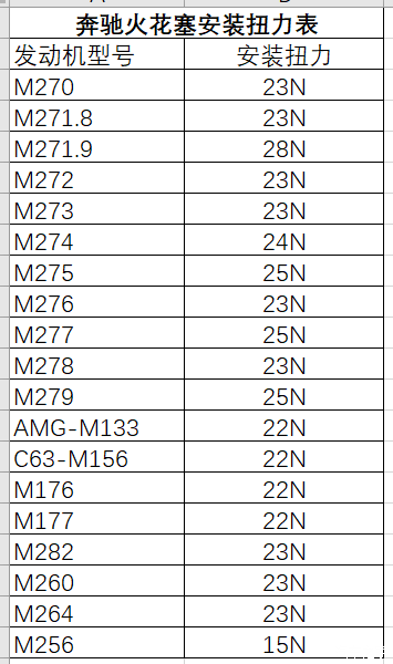 这里给大家做了一份奔驰常见发动机对应火花塞的安装扭力表供大家参考!