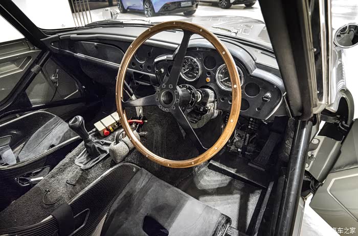 车内装用防滚架,可以从外面往内看的部分属于老款,包括方向盘,但其他部份却为驾驶而定制,包括碳纤维跑车化座椅,可见此台DB5是动态拍摄的复刻版。