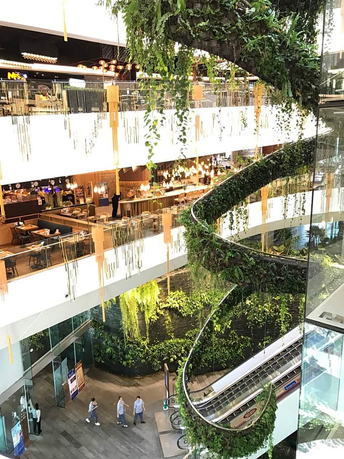 另外有一个户外花园同样让人惊叹,都市生活和大自然的完美结合,整个园林布局会让你惊叹无论从哪个角度看都非常好看。其中你会发现户外花园里每隔一定距离会设置火把,用的是真火,质感和放道具完全不一样,你会惊叹设计者对细节的苛刻。光在户外花园拍照都可以拍半小时。深深佩服这栋广场的建筑师,遗憾上网查查不到是谁,不然一定膜拜。