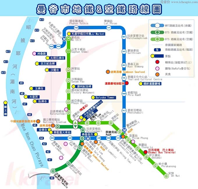 公交船,可以在BTS Saphan Taksin站换乘,乘坐公交船可以前往大皇宫(N9)、卧佛寺(N8)、郑王庙(N8对面)、唐人街(N5)、River City(N3)等。