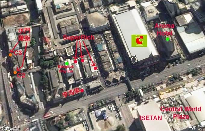 Chit Lom商业区和Siam商业区相隔BTS一个站,两个站之间还有一条人行天桥,沿着人行天桥往Chit Lom方向走约5分钟,左手边就是Central world Plaza