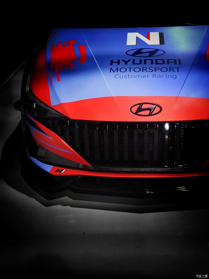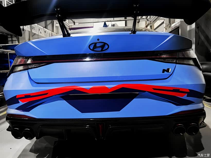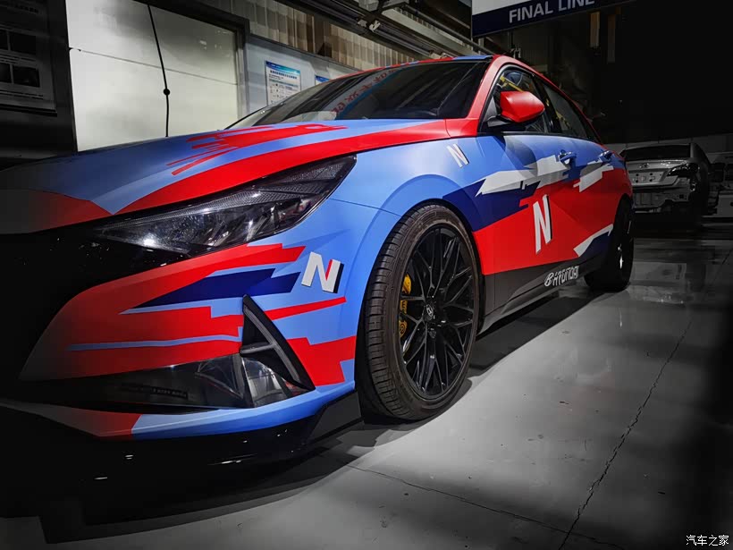 在外观上,我模仿了韩版的伊兰特N TCR赛车风格,是用亚光膜,整车按照TCR风格喷绘图案,1:1还原,颜色采用蓝与红的配色。