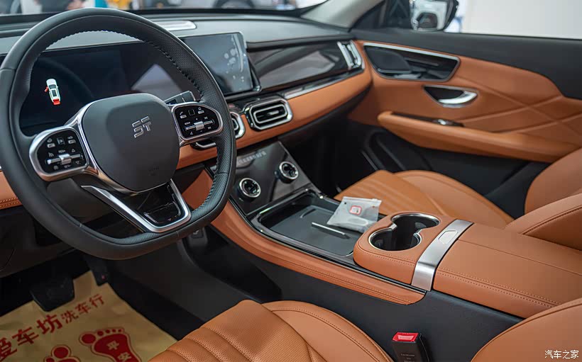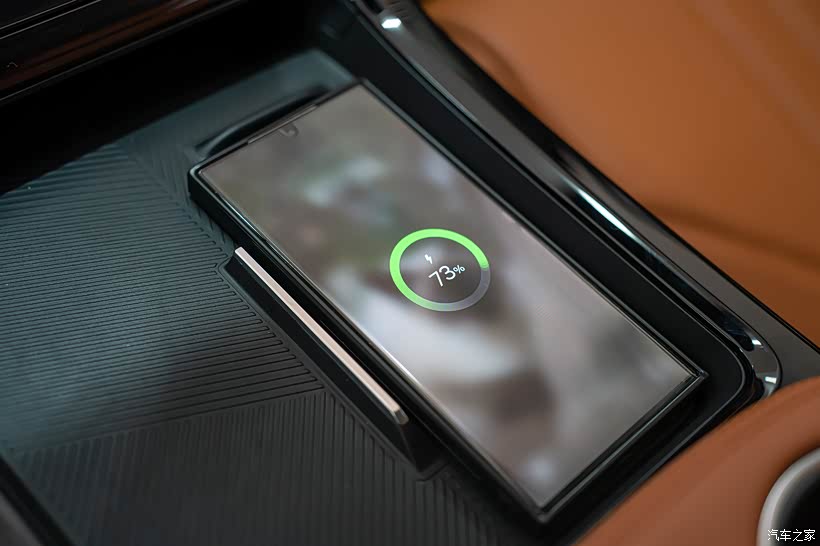 得益于怀挡换挡方式,中控扶手区域可利用空间更充裕起来,原本常规换挡位置变成了主副驾手机无线快充,快充功率为50W,从20%充到80%仅需半个小时,出行再也不必担心手机电量。