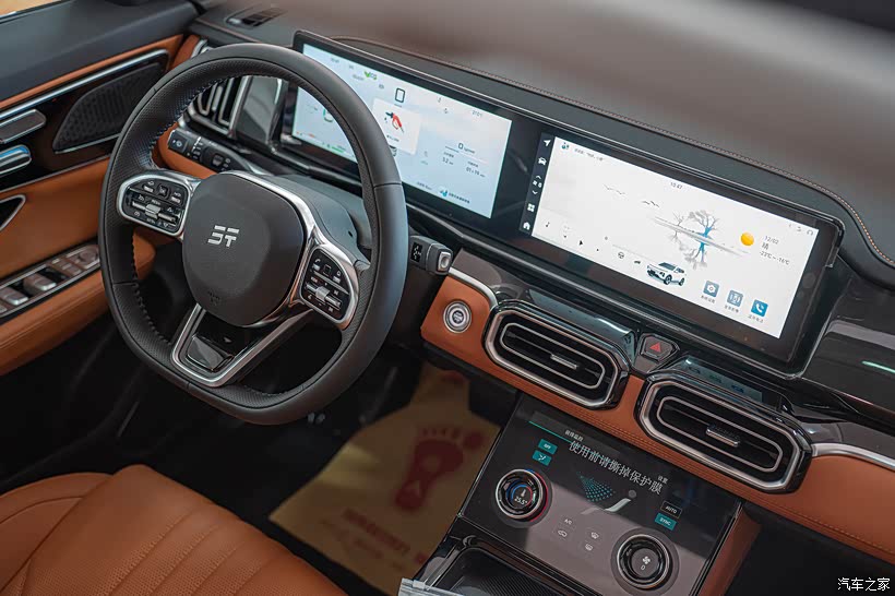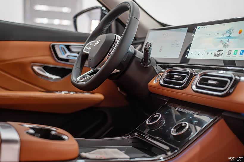 走进车内,内饰让人眼前为之一亮。黑橙撞色(也有蓝白撞色可选)在银色金属部件点缀下高级感顿时扑面而来。双12.3英寸连屏的中控台视觉效果出众,进一步增强了座舱内的科技感与豪华氛围。