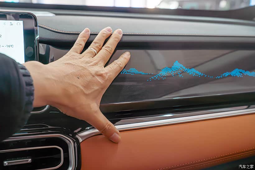 贯穿式的仪表台采用了双层设计,上层采用柔软的搪塑材质,下层则采用了质感优秀的皮革材质包裹。上深下浅的配色设计,极具视觉冲击力。介于两层之间的晶体氛围灯描绘出山峰形状,即暗合着山海名字的含义,也传达了“新旅行,自在山海”的产品理念。