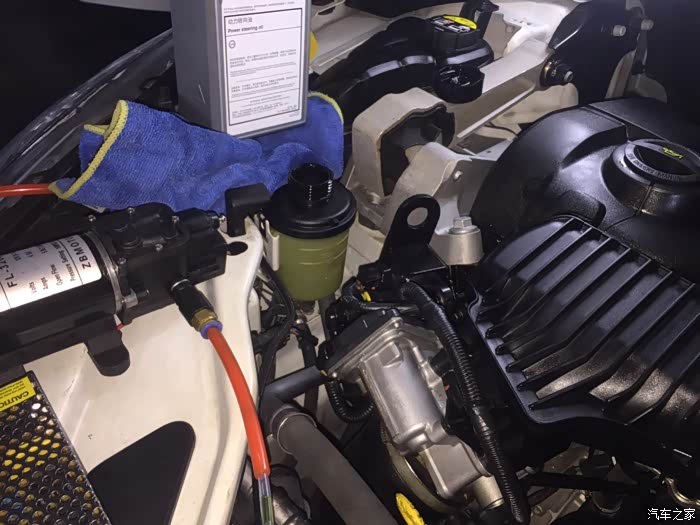 工具材料:隔膜泵一个,足够电力的稳压电源,足够长度的耐高温管子(抽机油可以用),足够大的空瓶子,助力油一壶1升,干净的能吸油的棉布若干。如果有人帮忙转方向就完美了。