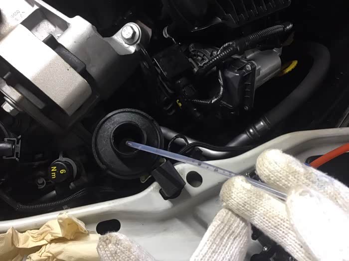 然后再启动车子,左右打方向,这时方向盘打起来就正常了。用同样的方法,把这些油再抽掉,这样做是更换的比较彻底的。毕竟新旧助力油在油的颜色和清澈度上,看起来不太有很明显的区别,但要求公里数更换,无非就担心油液变质嘛。