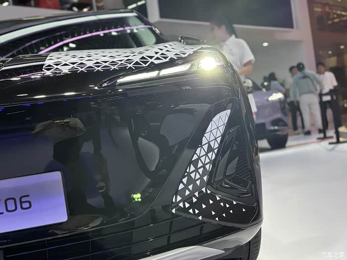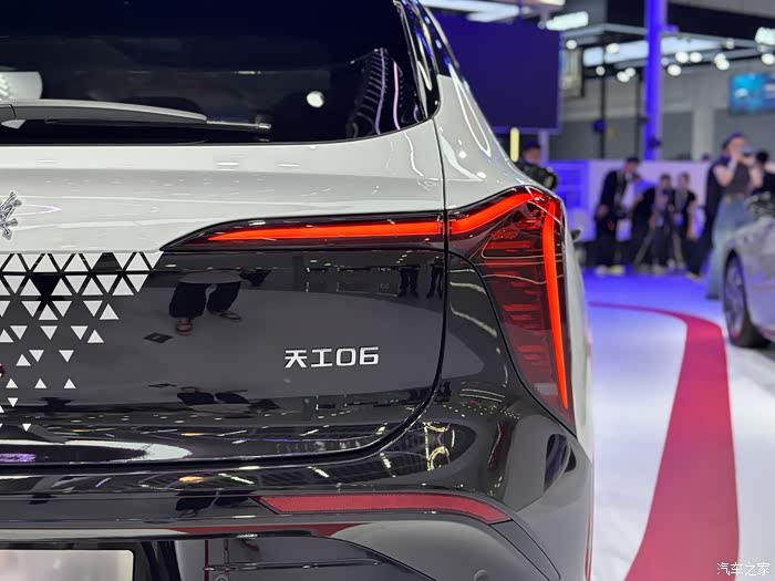 在外观方面,天工06采用了封闭式的前脸设计,并搭配了中置纵向布局的贯穿车标,极具辨识度!两侧的大灯组造型较为狭长,并内置LED日间行车灯组。此外,前包围两侧还采用了比较动感的三角形设计,两侧的通风开口采用纵向布局,前包围中间的通风开口下方还配有银色的装饰护板,整个前脸设计还是挺好看的