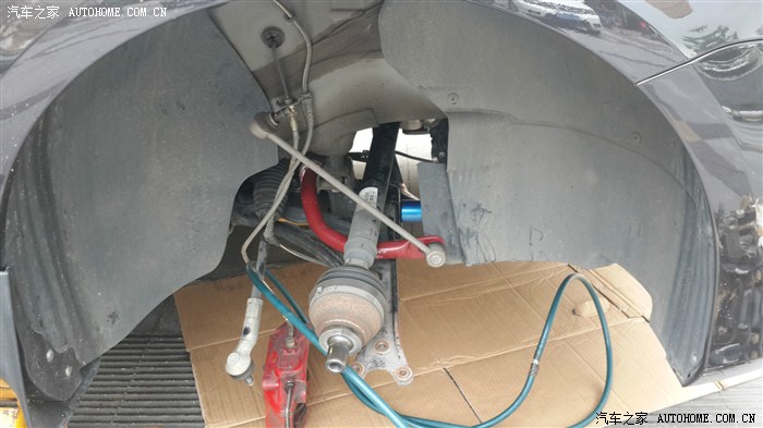 接下来就是负责的前避震了,整个前面的拆装过程占整个的2/3时间,费劲啊。看那两个师傅忙活得满身大汗,不容易啊。这个是前面拆掉了原车避震后的图,红色的杆子就是艾巴赫的前防倾杆,蓝色的是TCR的前底巴。
